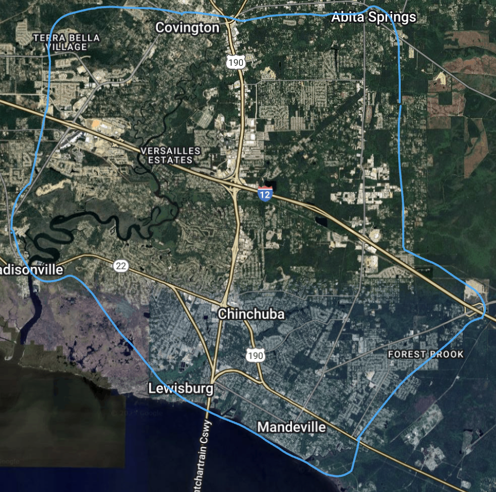 All of Mandeville and Covington as far North as Military Highway and as far West as Highway 21 and Terra Bella Village.